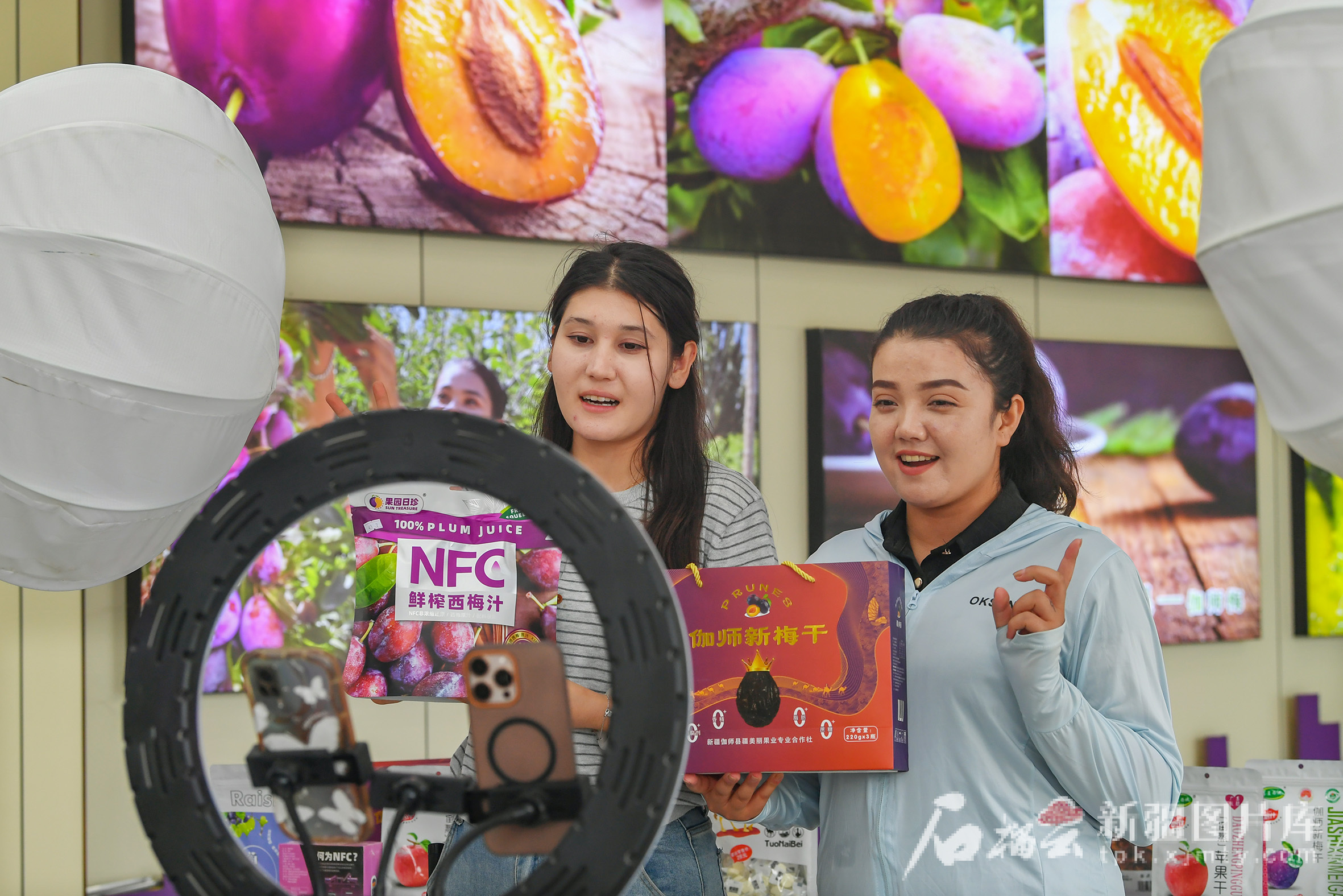 8月12日,工作人员在伽师县粤伽新梅现代产业园,通过电商平台推荐新梅产品。