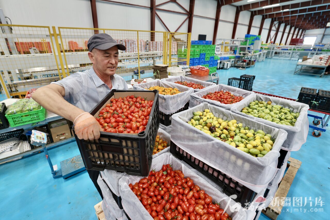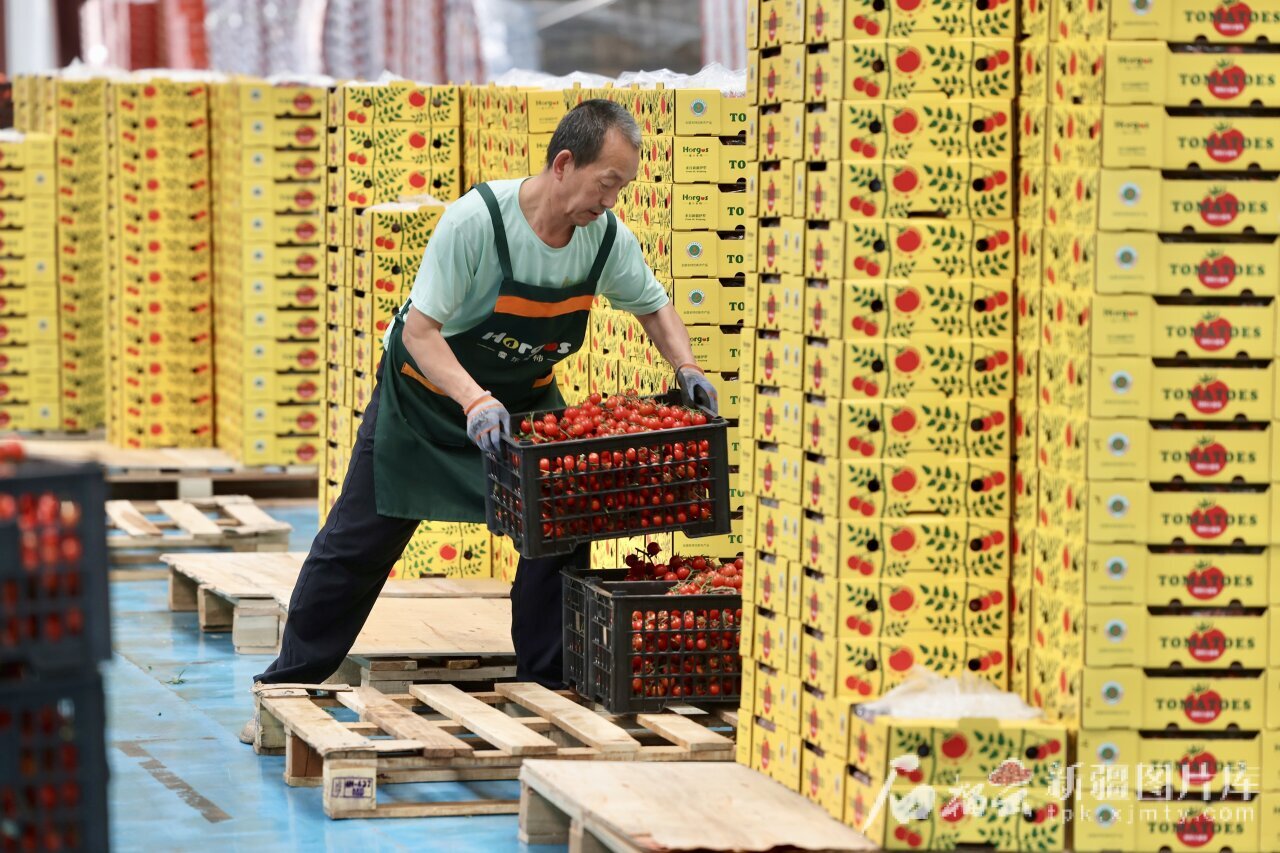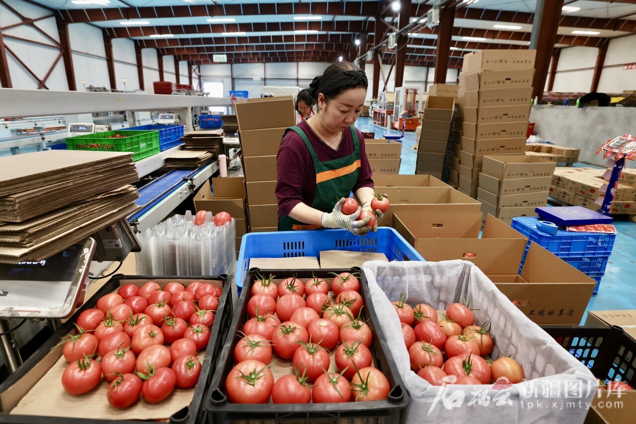 8月16日,霍尔果斯现代农业科技产业园,工作人员正在包装番茄。