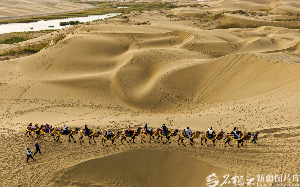 9月10日,游客在位于尉犁县墩阔坦乡的罗布人村寨景区骑骆驼游玩。(无人机摄)