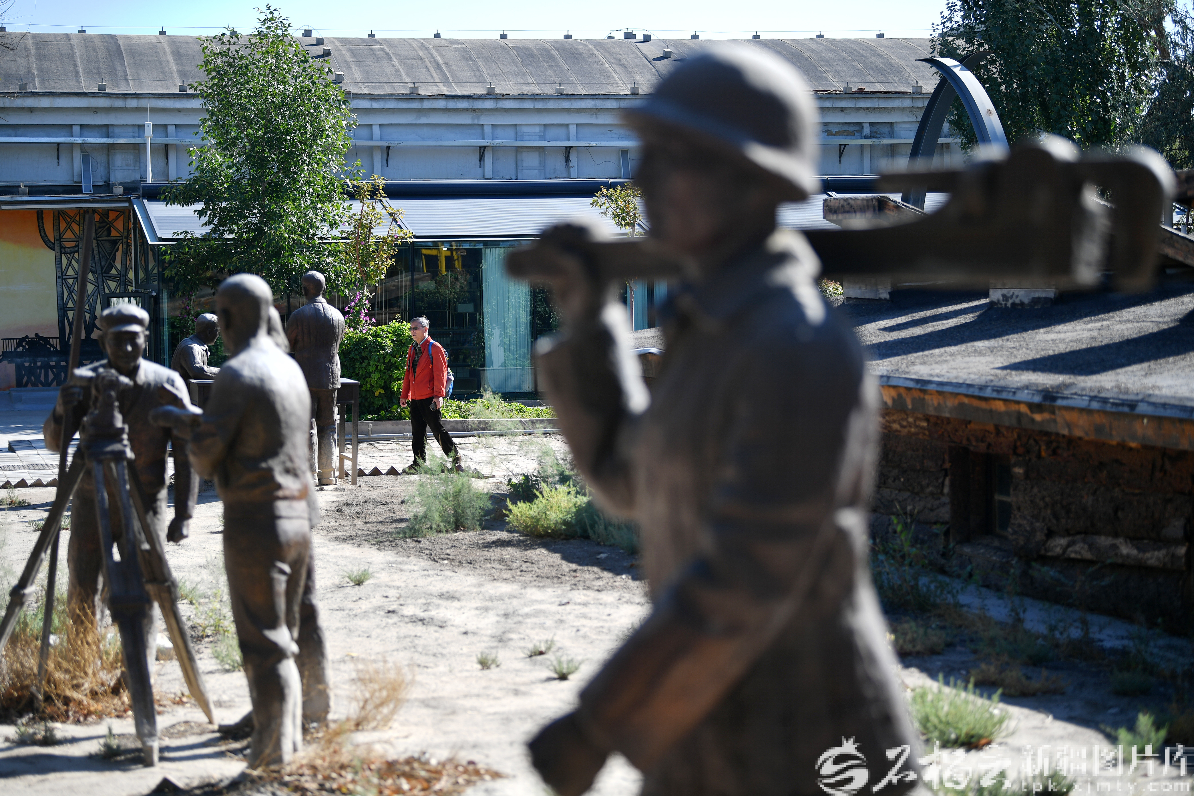 9月12日,采访团成员在克拉玛依市博物馆“开拓者”雕塑前采访中国石油大学(北京)克拉玛依校区学生。