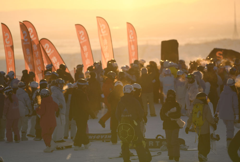 日落时分,阿勒泰市将军山国际滑雪度假区的山顶区域人头攒动(2025年1月24日摄)。新华社记者 胡虎虎 摄