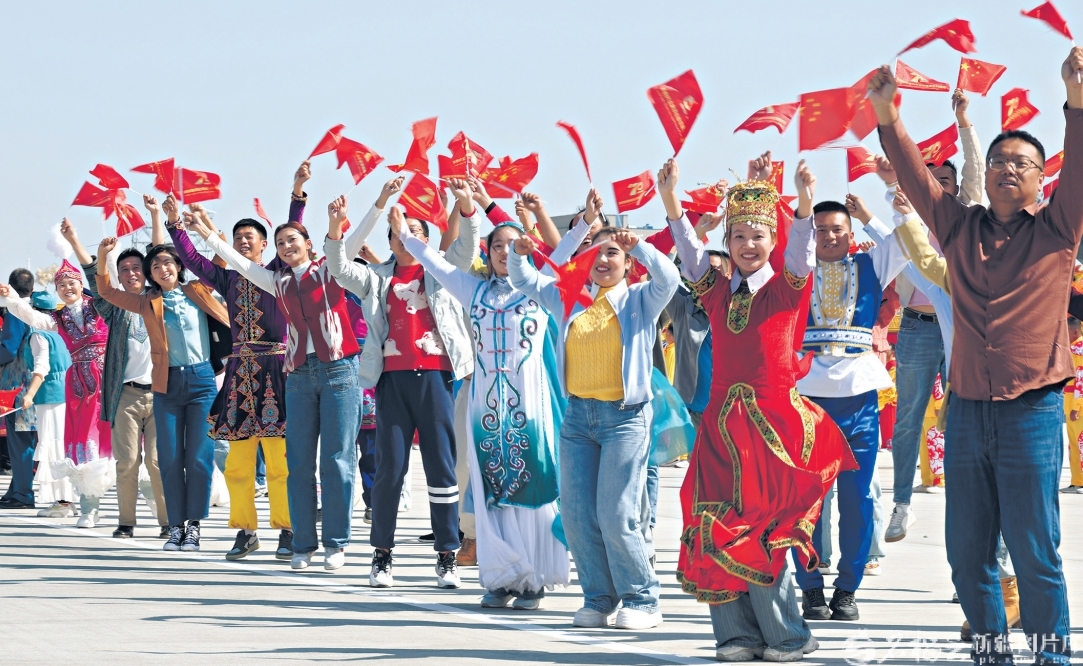 9月23日下午,中共中央总书记、国家主席、中央军委主席习近平率中央代表团乘专机抵达乌鲁木齐,出席新疆维吾尔自治区成立70周年庆?;疃?。这是自治区各族群众代表挥动红旗,热烈欢迎总书记的到来。天山网-新疆日报记者崔志坚摄