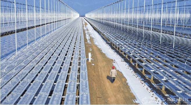 1月12日,工作人员在位于哈密市伊州区的大唐石城子100万千瓦“光热+光伏”一体化清洁能源示范项目现场巡查。目前,该项目90万千瓦光伏部分已并网发电,10万千瓦光热部分进入攻坚阶段,不久将实现全面投产。天山网-新疆日报记者蔡增乐摄