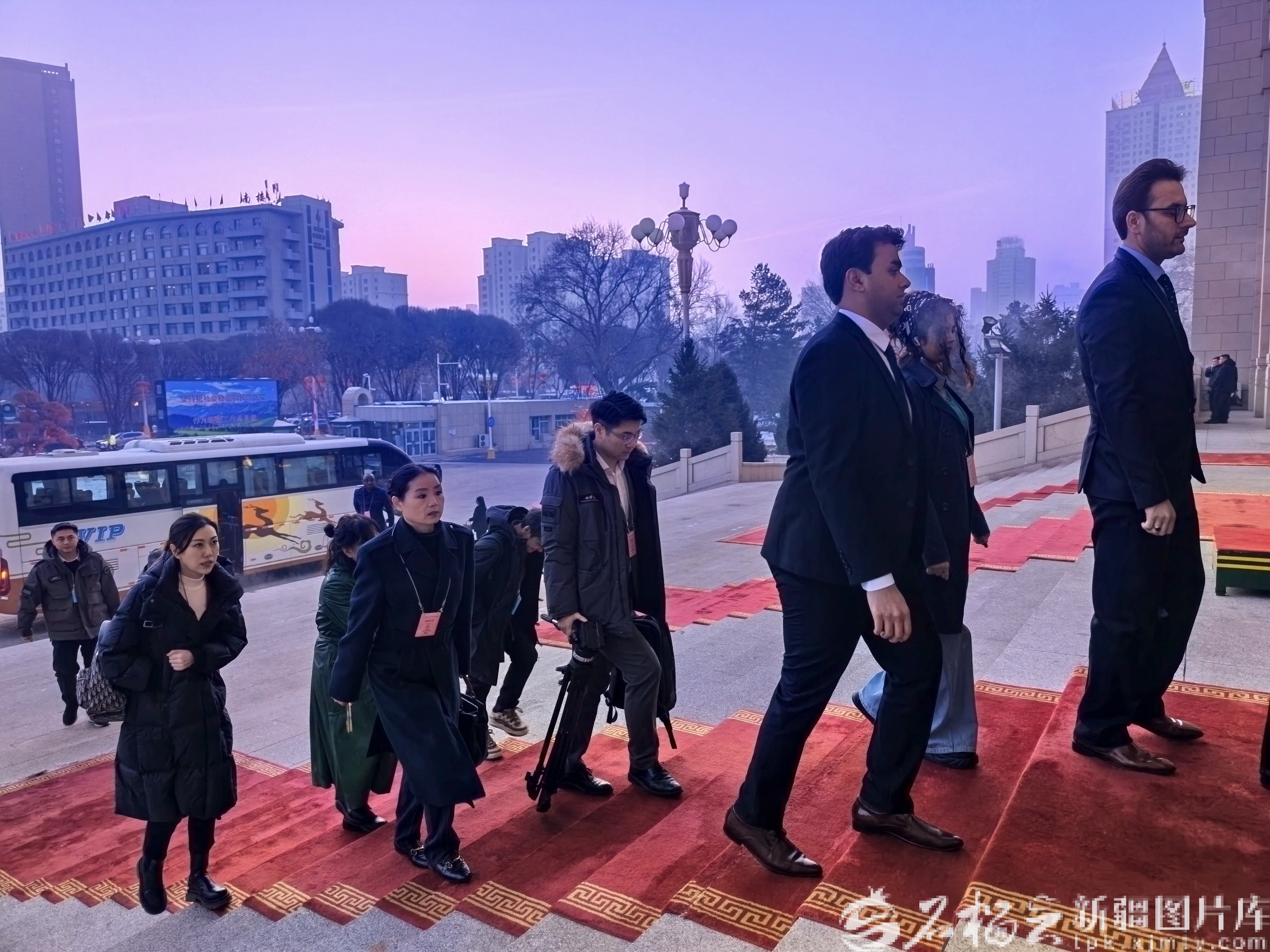 1月27日,自治区十四届人大四次会议在新疆人民会堂开幕。这是受邀嘉宾与外媒记者步入会场。石榴云/新疆日报记者 蔡增乐摄