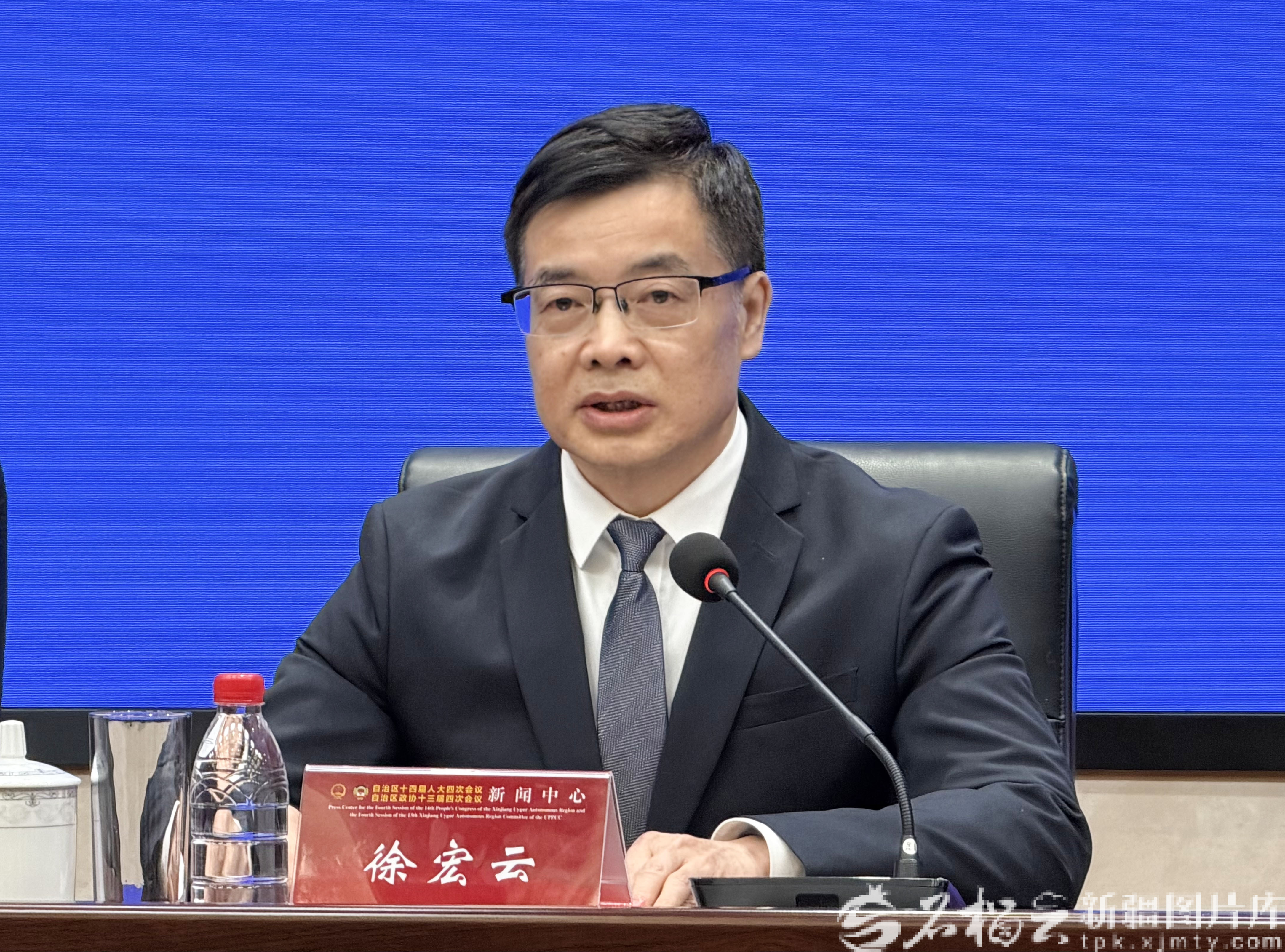 1月28日,2026新疆两会第三场新闻发布会举行。图为徐宏云作介绍。石榴云/新疆日报记者 李瑞摄