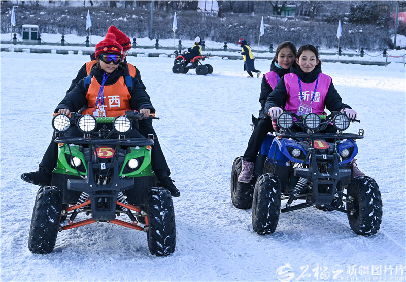 1月30日,南湖市民广场“玩冰乐雪”体验活动现场,广西代表团队员和新疆代表团队员在体验雪地摩托车。