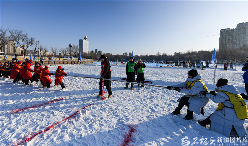 1月30日,南湖市民广场“玩冰乐雪”体验活动现场,来自各省区的队员参加拔河比赛。