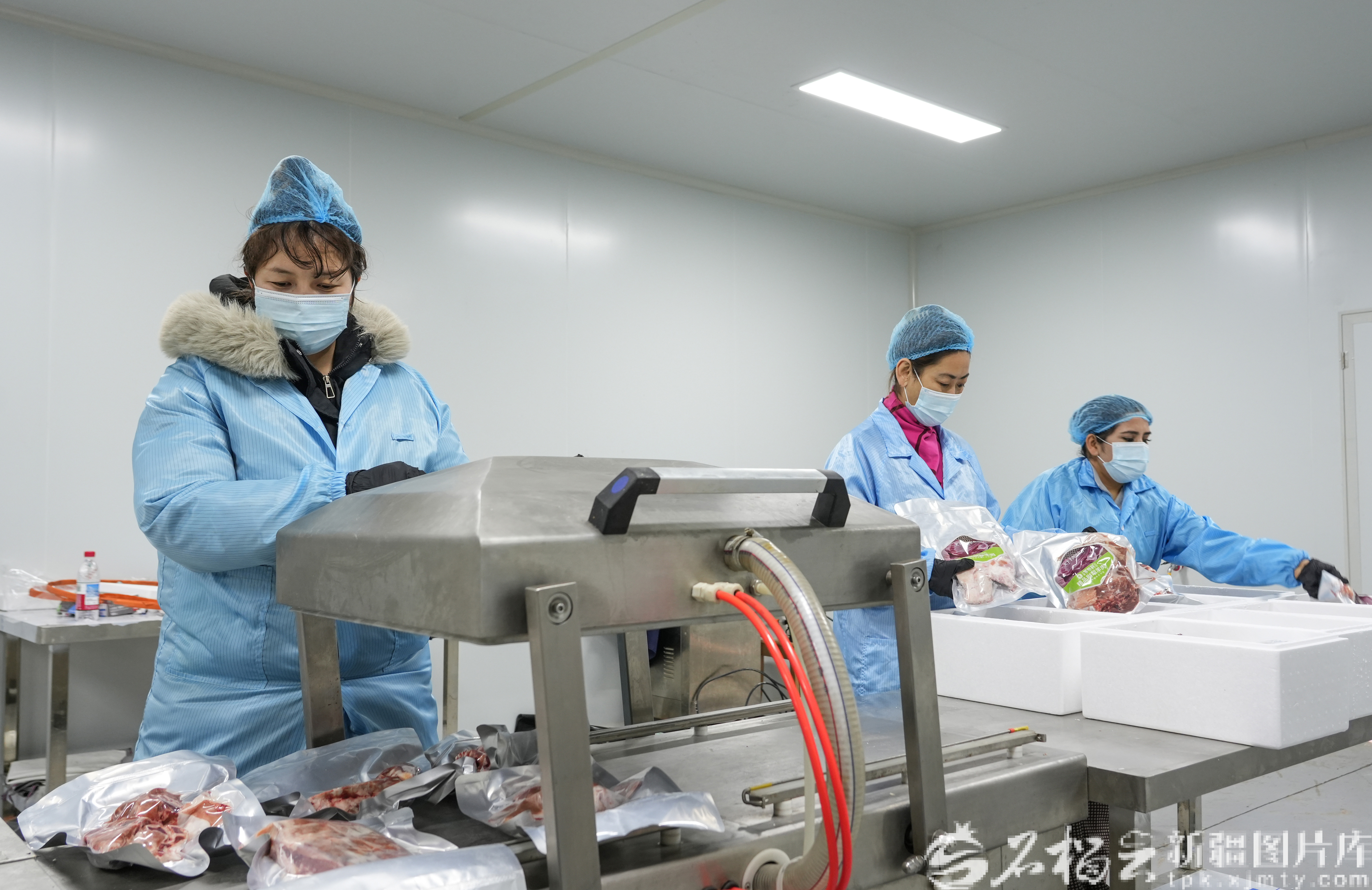 1月19日,新疆罗布村生物科技有限公司员工正在对生鲜产品“罗布羊”进行真空包装、张贴快递单,准备发货。乌尉高速公路通车后,依托这一物流优势,新疆罗布村生物科技有限公司的 “罗布村” 系列特色产品,远销广东、上海等多地。唐雪芹 摄