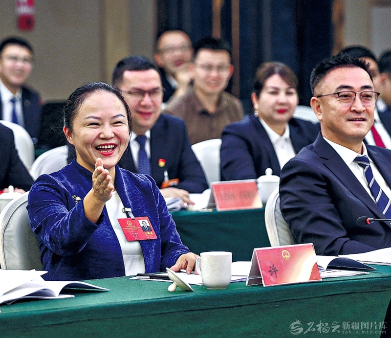 1月27日,许敏代表(前排左一)在参加巴音郭楞蒙古自治州代表团审议时,就大力发展畜牧业、让更多绿色优质农牧产品走向全国市场等内容发言。