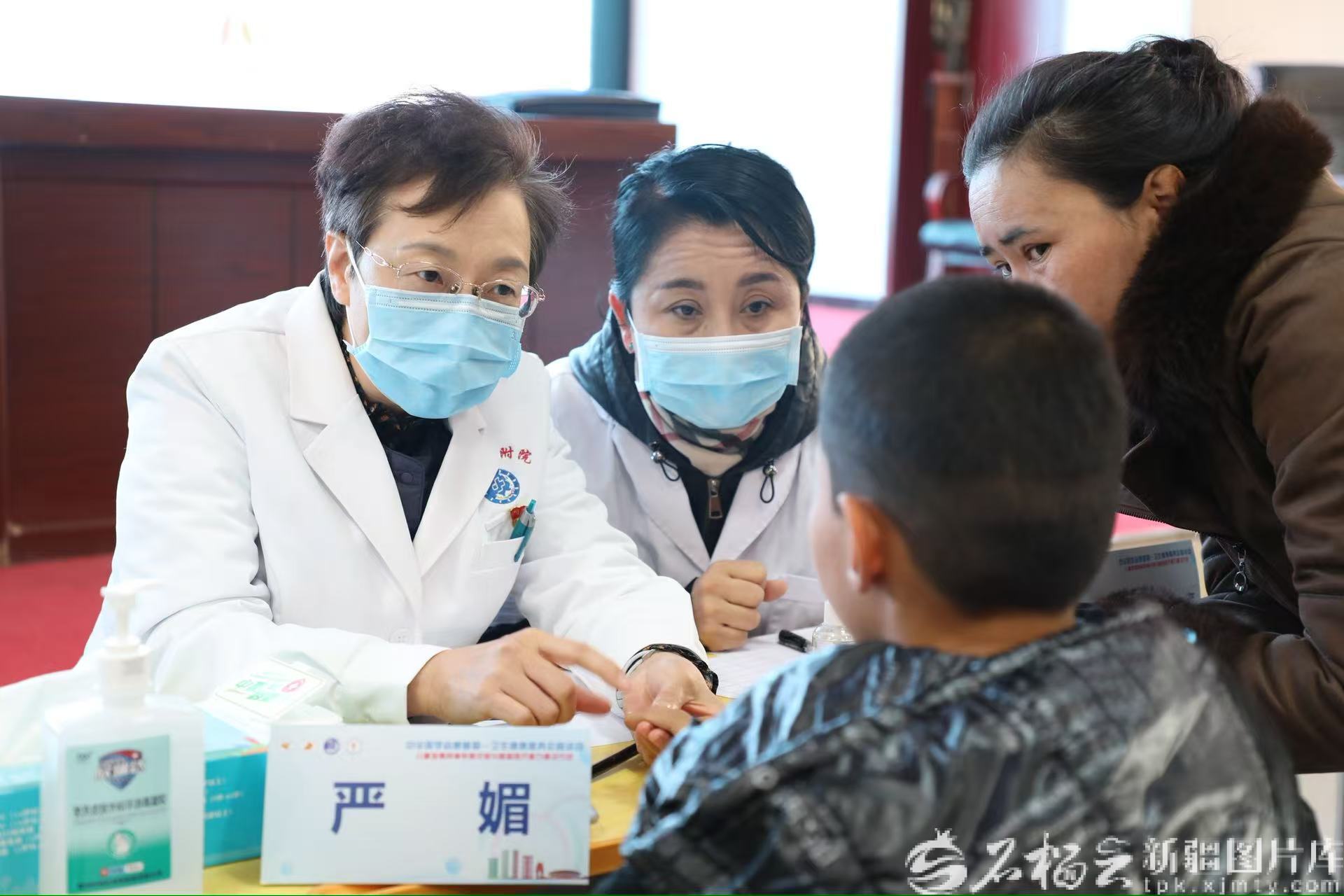 严媚(左)为患儿义诊(资料图)。新疆医科大学第一附属医院供图